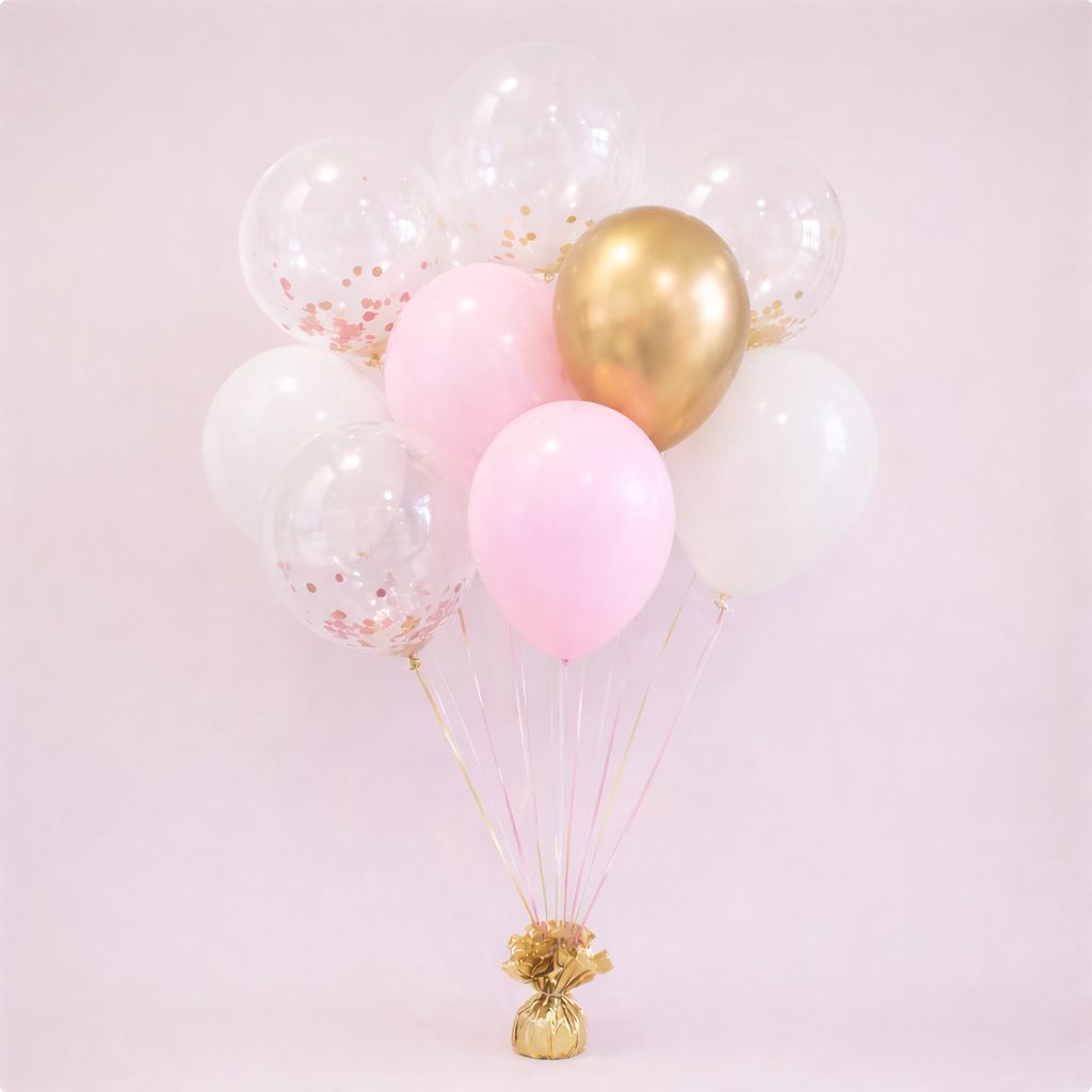 Bouquet is made up with 10 balloons. Balloons include 4 clear sequin confetti balloons and an assortment of gold, pink & white colours. Bouquet includes weighted base.