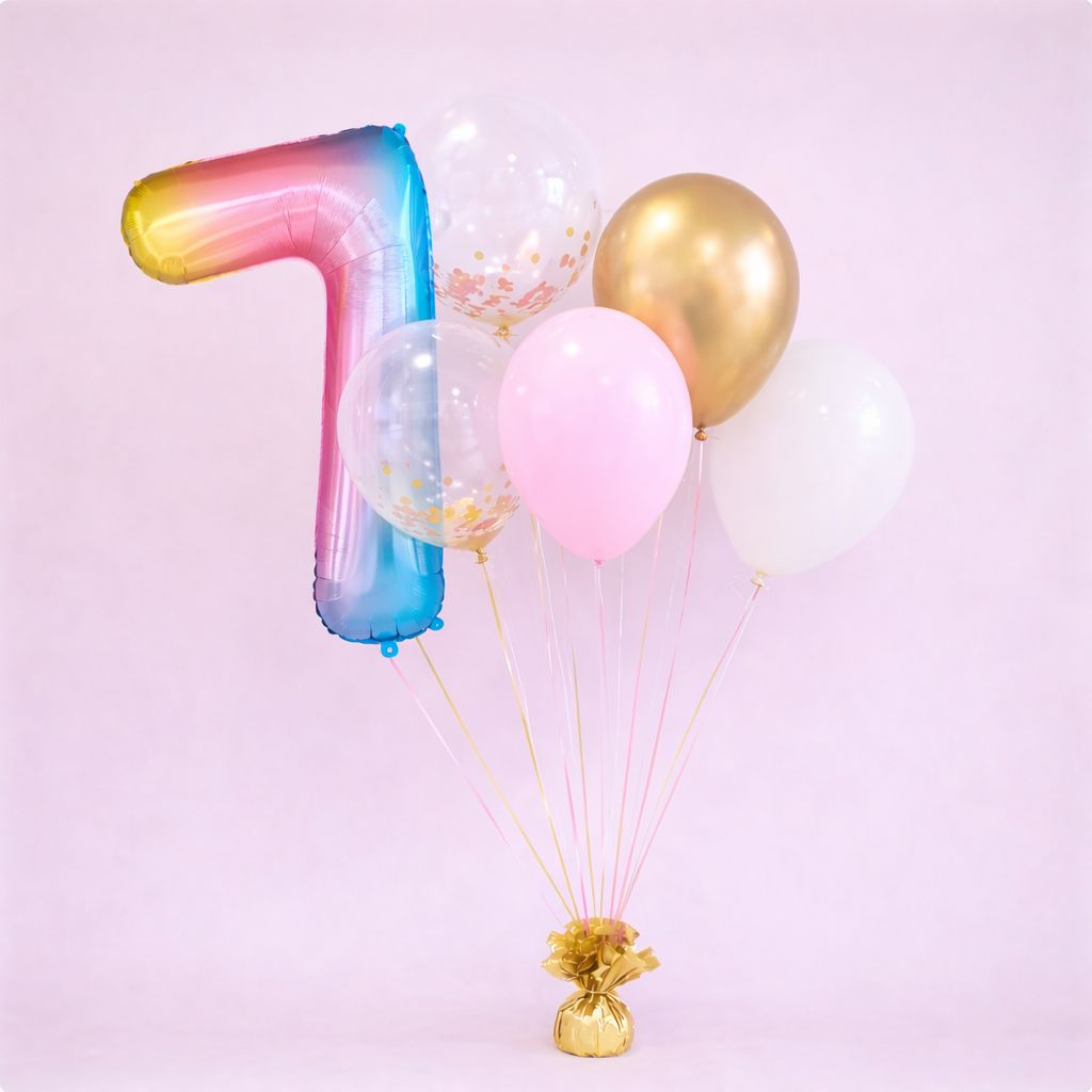 Bouquet is made up with 6 balloons. Balloons include 1 large number balloon, 2 clear sequin confetti balloons and an assortment of gold, pink & white colours. Bouquet includes weighted base.